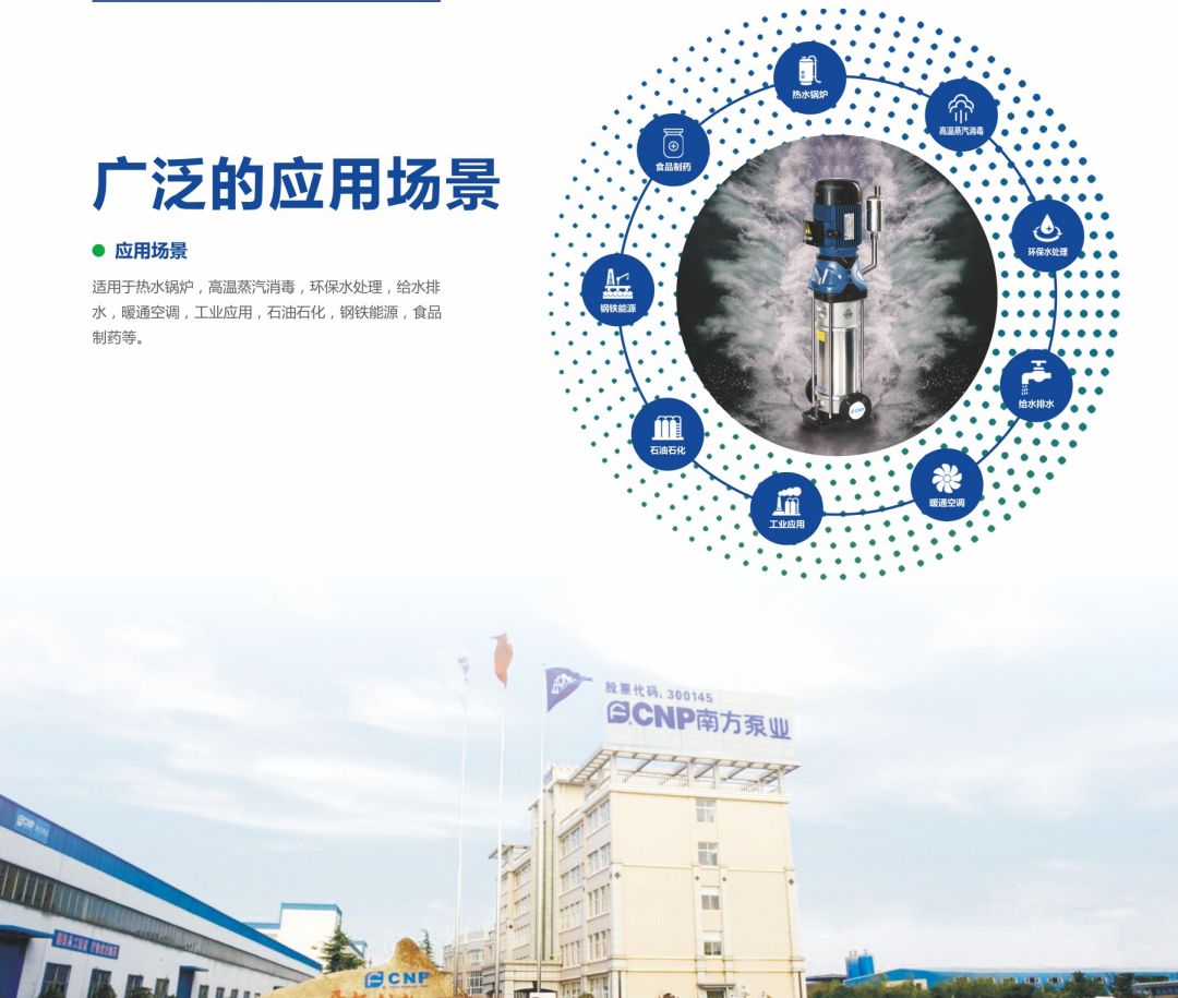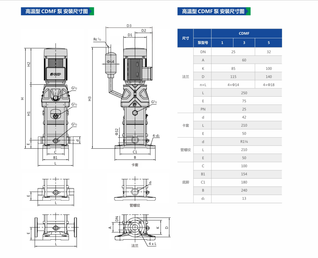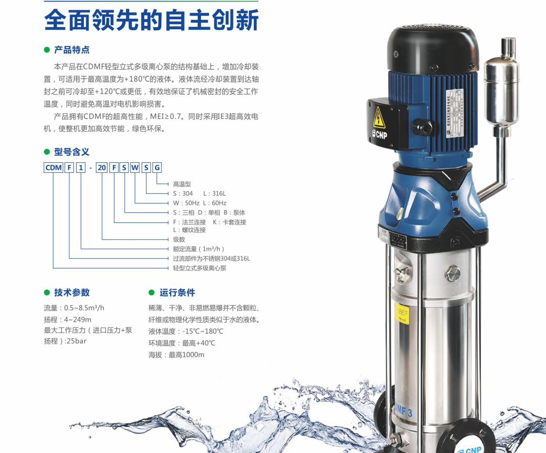 本產(chǎn)品在CDMF輕型立式多級離心泵的結(jié)構(gòu)基礎(chǔ)上,增加了冷卻裝置,適用于最高溫度為+180℃的液體。液體流經(jīng)冷卻裝置到達機封腔處可冷卻至+120℃或更低,有效保證機械密封的安全工作溫度,同時避免高溫對電機的損害影響。產(chǎn)品擁有CDMF的超高性能,MEI≥0.7。同時采用IE3超高效電機,使產(chǎn)品更加高效節(jié)能,綠色環(huán)保。