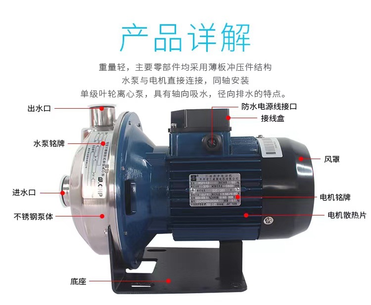 產品說明:南方ms,mss非自吸不銹鋼臥式單級離心泵,主要零部件采用不銹鋼板沖壓結構,配加長軸電機,軸向入口和徑向出口。