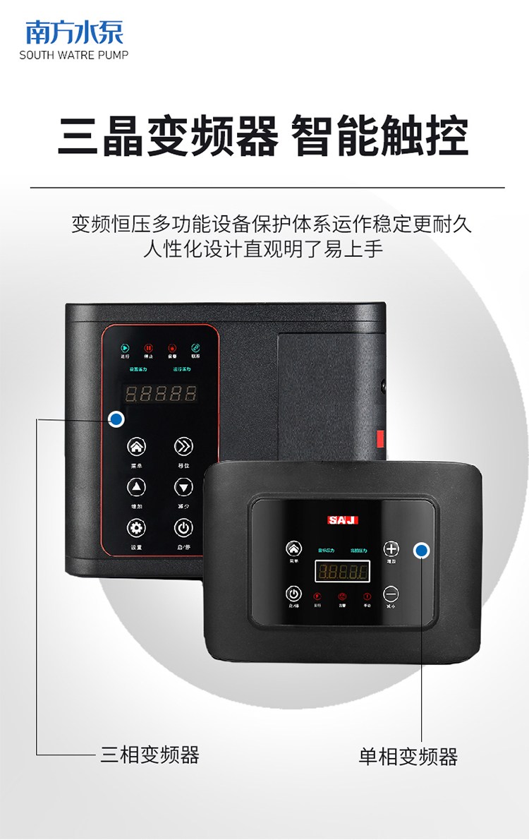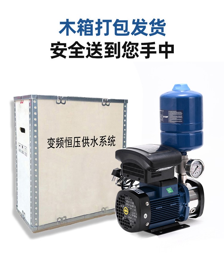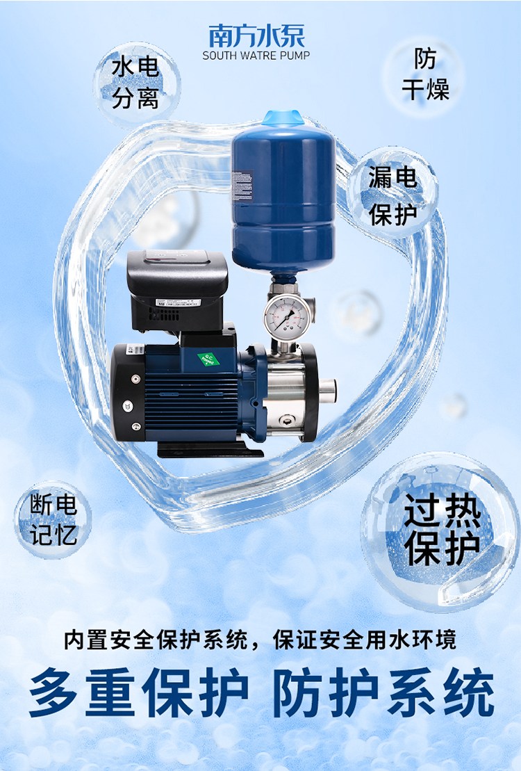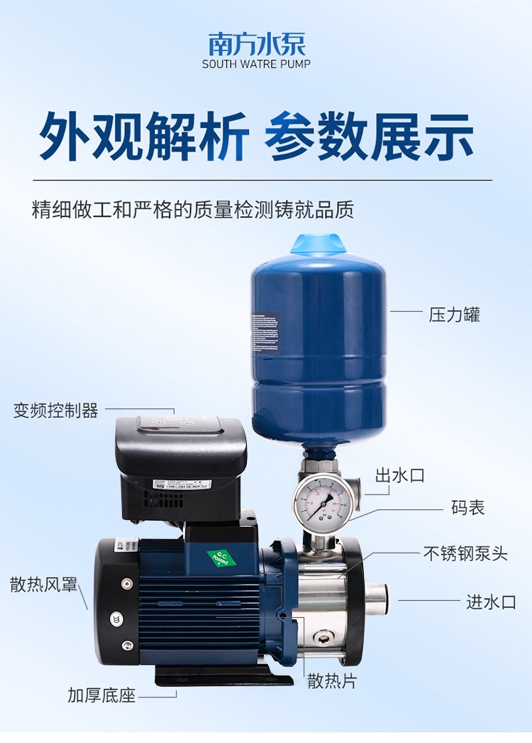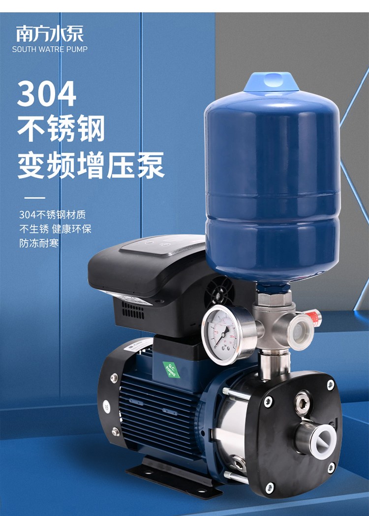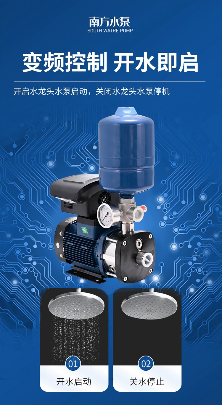 南方CHME系列臥式智能恒壓變頻泵采用了變頻調速及自動化控制相結合的技術,配合高效節能的CHM非自吸輕型臥式多級離心泵。整機主要由CHM泵、控制器、傳感器、壓力罐、五通止回閥及軸向抗震壓力表等組成。具有性能穩定、高效節能、全自動智能控制、低噪音、耐腐蝕、結構緊湊、外形美觀、體積小、重量輕等特點。