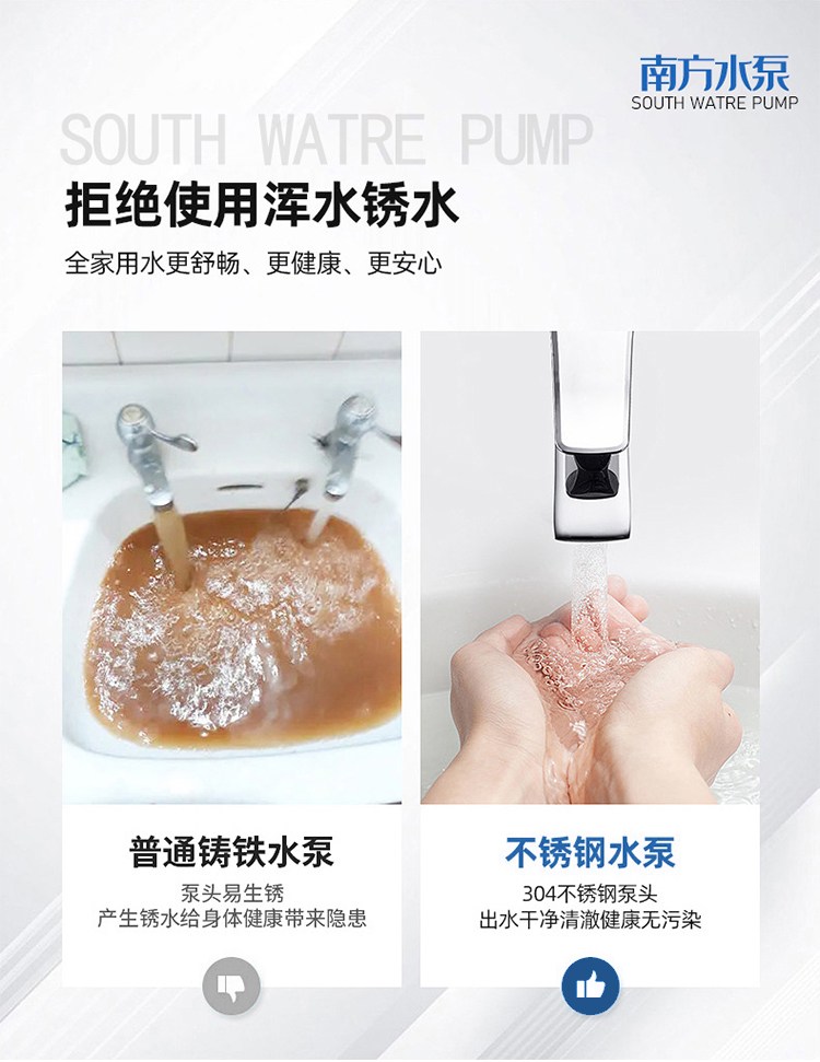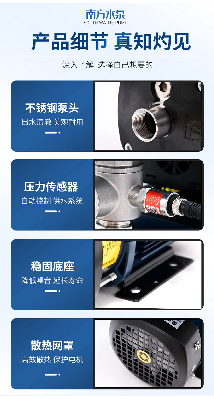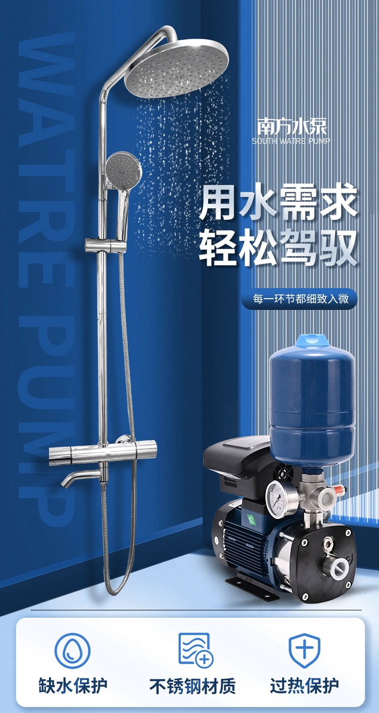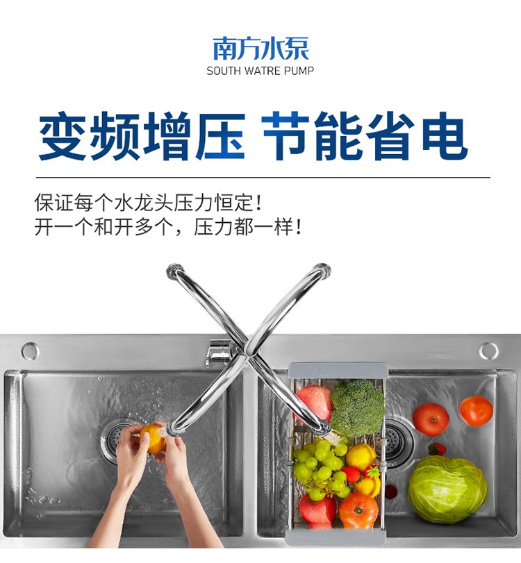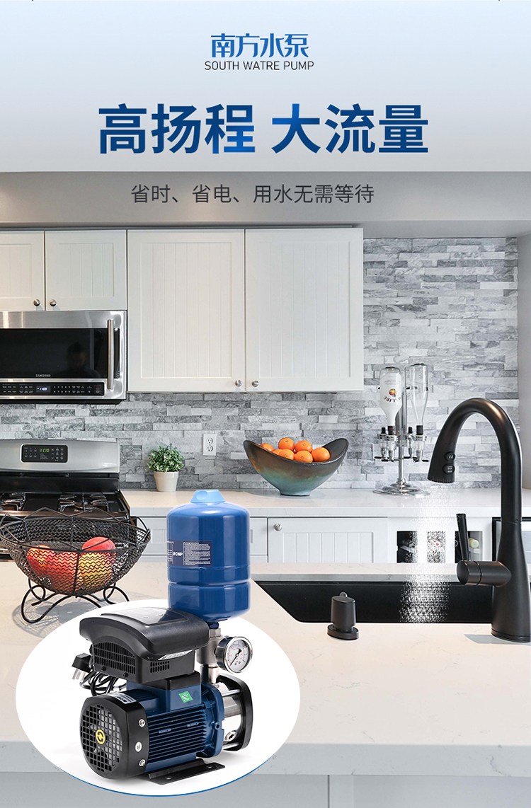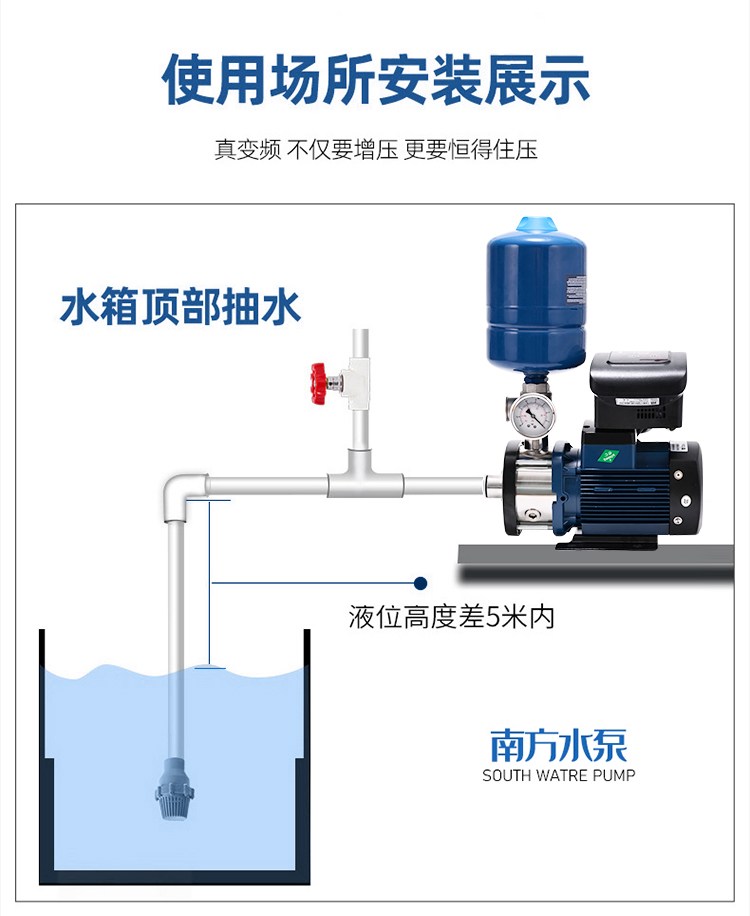 南方CHME系列臥式智能恒壓變頻泵采用了變頻調速及自動化控制相結合的技術,配合高效節能的CHM非自吸輕型臥式多級離心泵。整機主要由CHM泵、控制器、傳感器、壓力罐、五通止回閥及軸向抗震壓力表等組成。具有性能穩定、高效節能、全自動智能控制、低噪音、耐腐蝕、結構緊湊、外形美觀、體積小、重量輕等特點。