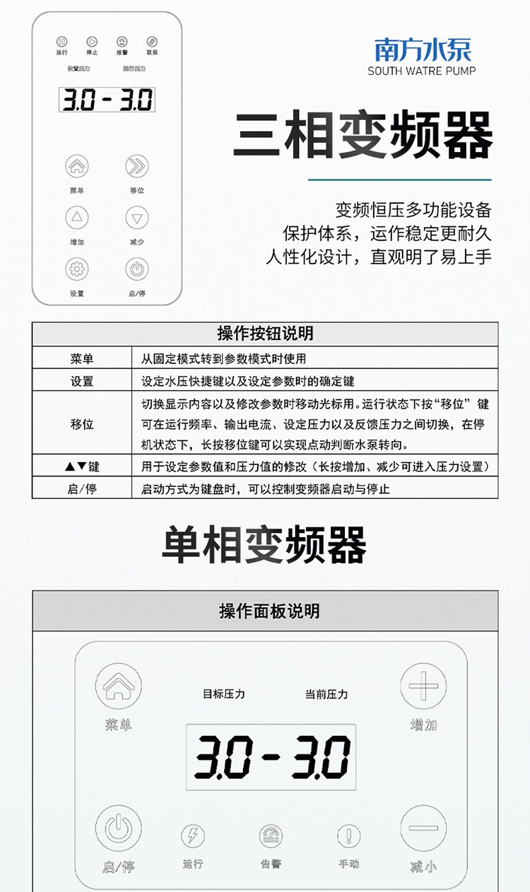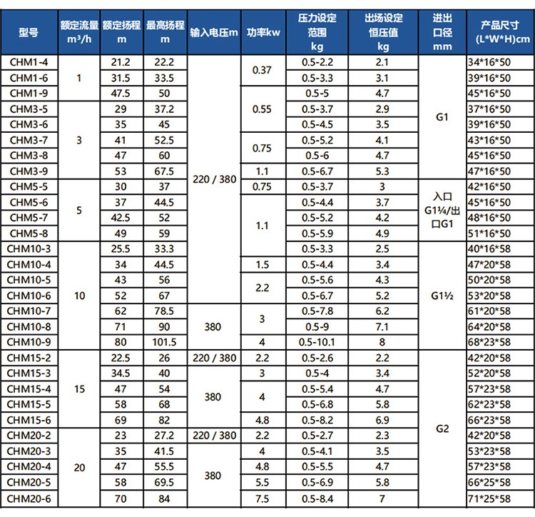 產品說明:南方chme系列臥式智能恒壓變頻泵采用了變頻調速及自動化控制相結合的技術,配合高效節能的chm非自吸輕型臥式多級離心泵。