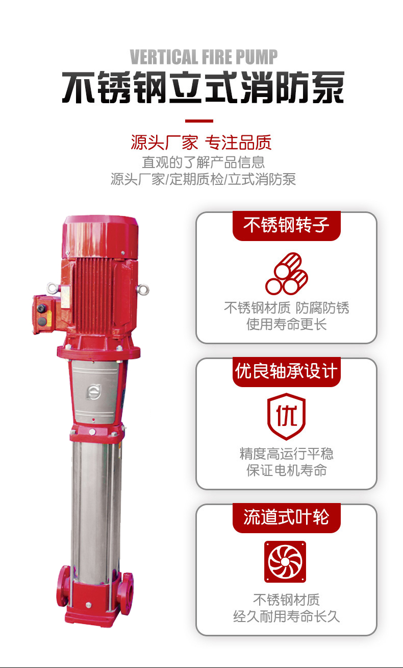 南方XBD非自吸立式多級消防泵組,電機軸通過聯軸器直接與泵軸聯接,葉輪導葉采用不銹鋼板沖壓焊接或不銹鋼精密鑄造制成,泵進出水口在泵底同一直線上。