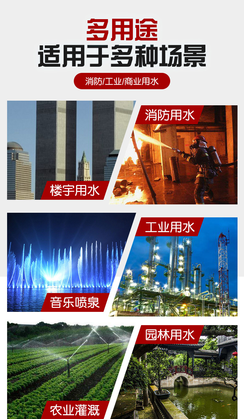 應用領域:供水系統、鍋爐給水和冷凝系統、滅火系統、水處理、消防穩壓系統